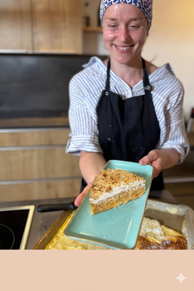 Der Apfel-Nusskuchen mit Vanillepudding ist ein vielseitiger und beeindruckender Kuchen, der durch seine Kombination aus verschiedenen Texturen und Aromen überzeugt. Der luftige Biskuit, das fruchtige Apfelkompott, die cremige Sahneschicht und die knusprigen Streusel machen ihn zu einem echten Highlight.