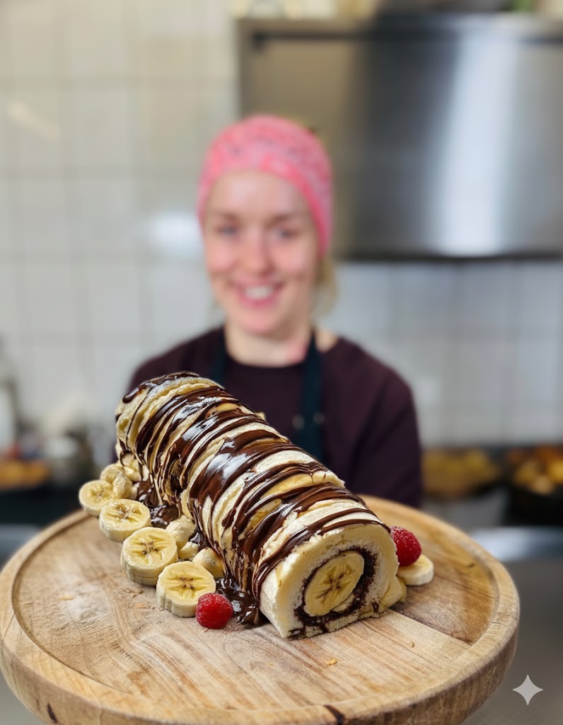 Die Kombination aus Banane und Schokolade gehört zu den beliebtesten Geschmackskombinationen weltweit. In Form einer Biskuitrolle wird dieses Duo noch einmal auf ein neues Level gehoben. Die luftige Textur des Biskuits harmoniert perfekt mit der cremigen Füllung, während die Banane für eine natürliche Süße sorgt.