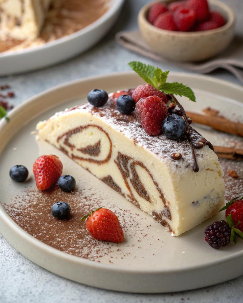 Prima di portarlo in tavola, decora il rotolo con una spolverata di cacao amaro, abbondanti frutti di bosco freschi e qualche fogliolina di menta. Puoi servirlo intero oppure già tagliato a fette, per mettere in risalto il bellissimo effetto marmorizzato interno.