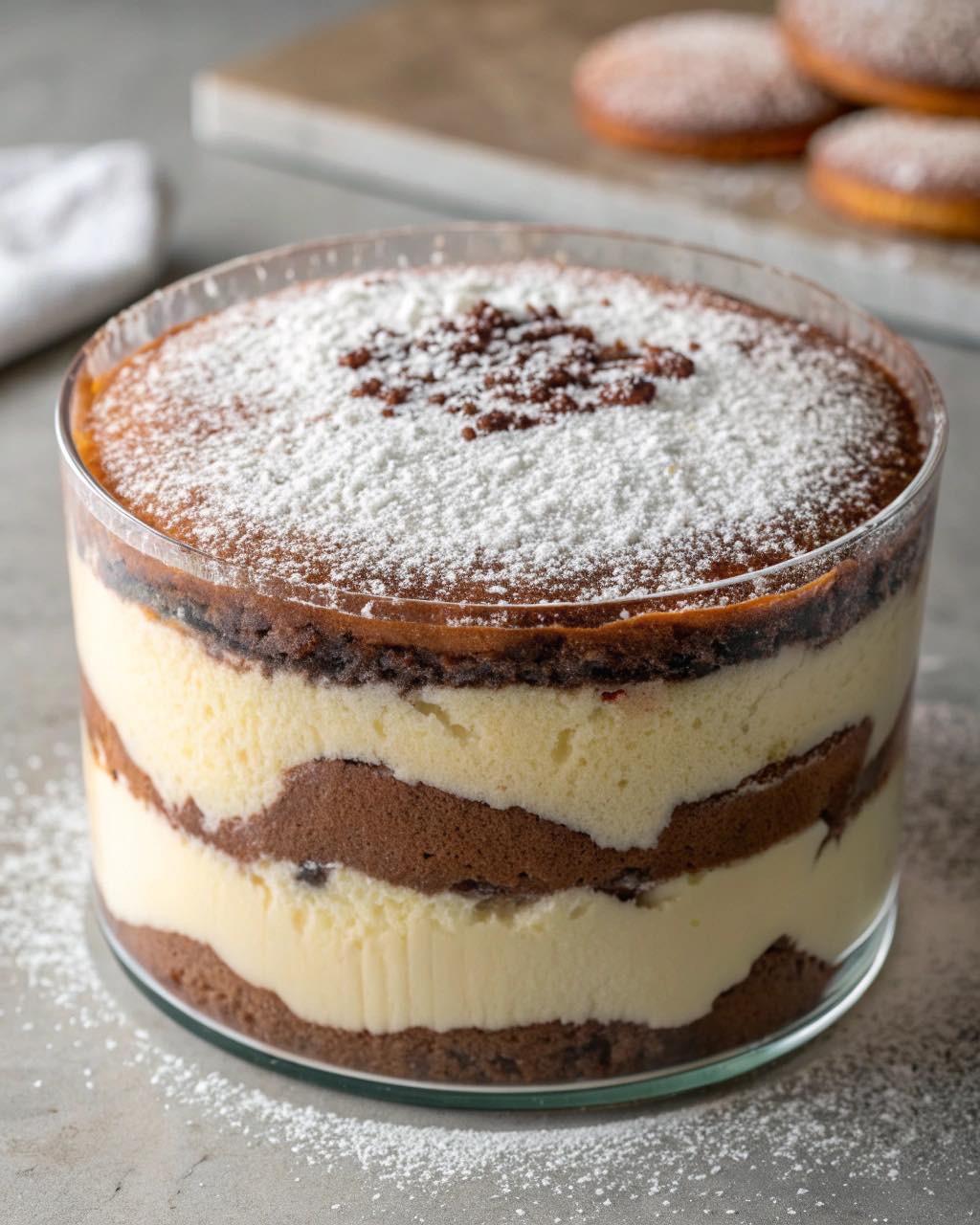 Il successo di questo dolce dipende dall’equilibrio tra gli ingredienti. La crema al mascarpone è morbida, ricca e vellutata, mentre il pan di Spagna al cacao aggiunge struttura, sapore e profondità. La decorazione finale con zucchero a velo e cioccolato completa il tutto con un tocco elegante e invitante.