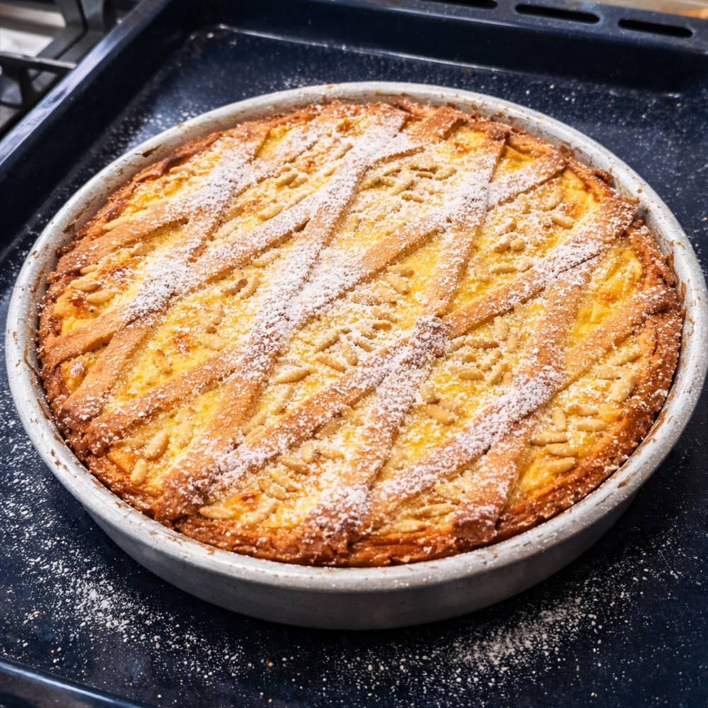 Un altro dettaglio importante è l’aroma di limone, che dona freschezza alla crema pasticcera e si sposa perfettamente con la dolcezza dell’impasto e con il gusto delicato dei pinoli.