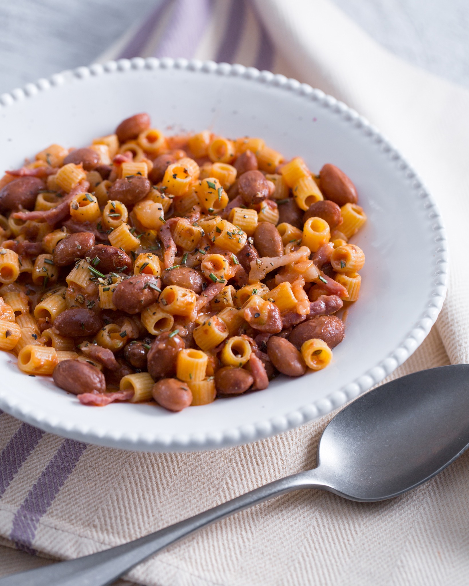 Infine si versa la pasta direttamente nella pentola con il condimento, aggiungendo altra acqua di cottura dei fagioli fino a raggiungere la consistenza desiderata. La pasta cuoce lentamente assorbendo tutto il sapore del sugo, e solo alla fine si unisce la crema di fagioli tenuta da parte insieme al rosmarino tritato. Dopo un breve riposo a fuoco spento, la pasta e fagioli è pronta per essere servita, completata da una macinata di pepe nero e, volendo, da un filo di olio extravergine a crudo.